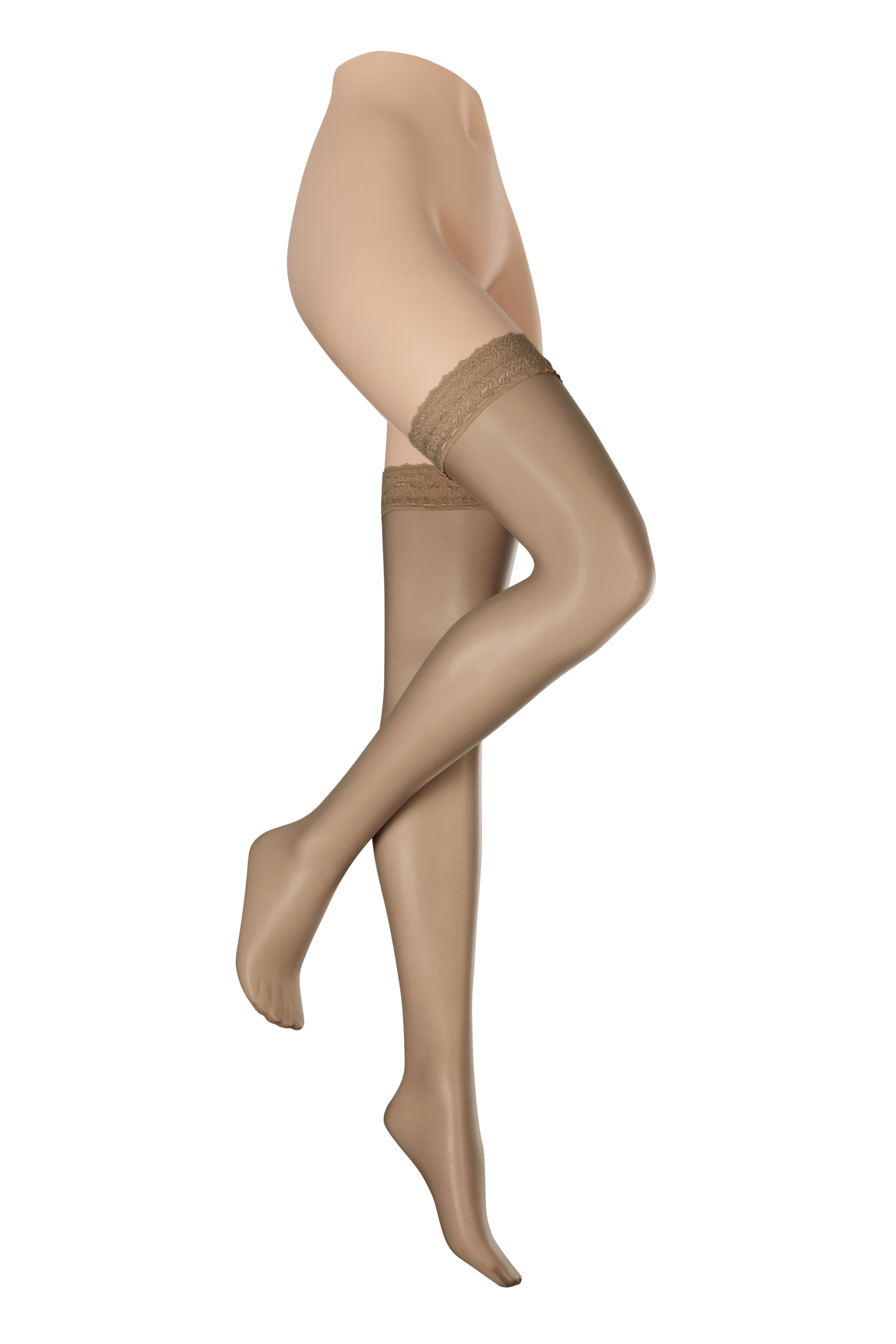 Der Perfekte Nude-Look für Ihre Beine - halterlose Strümpfe, ultratransparent und matt, modisches Spitzenband mit Doppel-Silikonstreifen, transparent verstärkte Spitze. 14 DEN